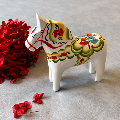 木彫りの馬に、ダーラナ地方の伝統的な花模様「Kurbits(クルビッツ)」が描かれているのが特徴です。